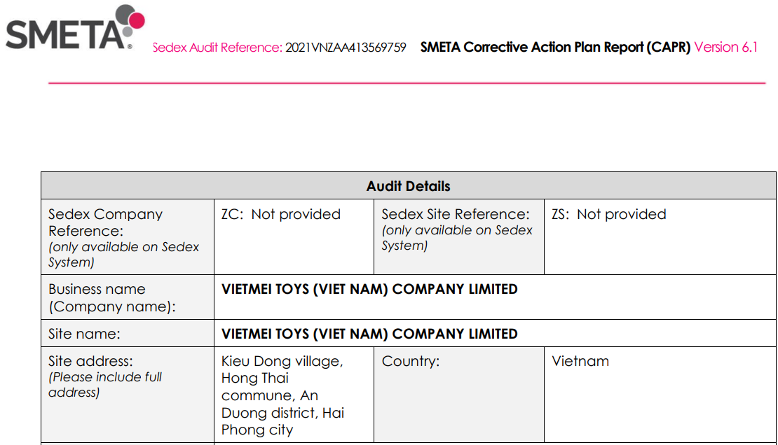 越美玩具(越南)有限公司【VIETMEI TOYS (VIET NAM) COMPANY LIMITED】在創思維技術服務(越南)有限公司輔導中2021年順利通過ITS突擊審核的Sedex 4P驗廠,創思維2020年還幫助貴司順利通過ICTI驗廠。